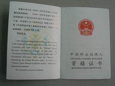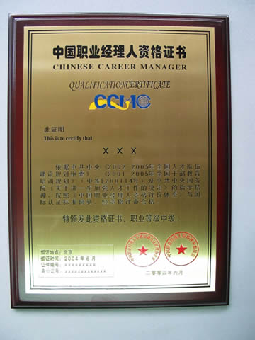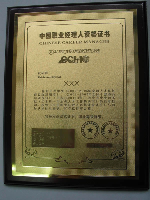 资格证书:通过资格认证后,将由中国职业经理人联合会和中国职业经理人资格认证管理办公室共同颁发《中国职业经理人》资格证书及相应的银、铜制金属证书.