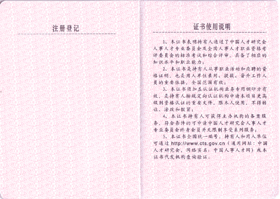 ◇ 中华人民共和国CTS职业人员资格证书样本